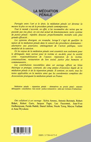 Partagée entre l'art et le droit, la médiation pénale est devenue la mesure la plus en vue de la procédure pénale contemporaine. Tout le monde s'accorde à lui reconnaitre des vertus que ne possède pas (ou plus), en son état actuel de fonctionnement, notre système de justice pénale: rapidité, douceur, proportionnalité, moindre coût, plus grande efficacité... Cet ouvrage offre un bilan théorique et pratique, contrasté, de cinq années d'existence légale. Il contient tous les textes applicables en la matière ainsi que les coordonnées complètes des associations pratiquant la médiation pénale en France.