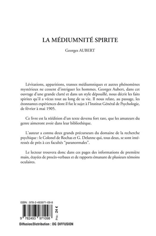 Lévitations, apparitions, transes médiumniques et autres phénomènes mystérieux ne cessent d'intriguer les hommes. Georges Aubert, dans cet ouvrage d'une grande clarté et dans un style dépouillé, nous décrit les faits spirites qu'il a vécus tout au long de sa vie. Il nous relate, au passage, les étonnantes expériences dont il fut le sujet à l'Institut Général de Psychologie, de février à mai 1905. Ce livre est la réédition d'un texte devenu fort rare, que les amateurs du genre aimeront avoir dans leur bibliothèque. L'auteur a connu deux grands précurseurs du domaine de la recherche psychique: le Colonel de Rochas et G. Delanne qui, tous deux, se sont intéressés de près à ces facultés" paranormales".