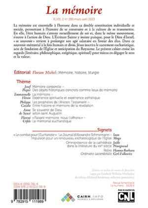 La mémoire est essentielle à l'homme dans sa double constitution individuelle et sociale, permettant à l'histoire de se construire et à la culture de se transmettre. L'Écriture Sainte en fait un attribut divin car, pour le Dieu d'Israël, se souvenir revient à prolonger son agir salutaire en faveur des élus. Et c'est dans ce souvenir-mémorial à la fois humain et divin que Jésus inscrira le sacrement eucharistique, acte de fondation de l'Église et anticipation du Royaume. Le présent cahier croise les regards (littéraire, philosophique, exégétique, spirituel) pour mieux en dégager le sens et la valeur, à une époque où le risque d'éclatement des mémoires n'est certes pas absent.