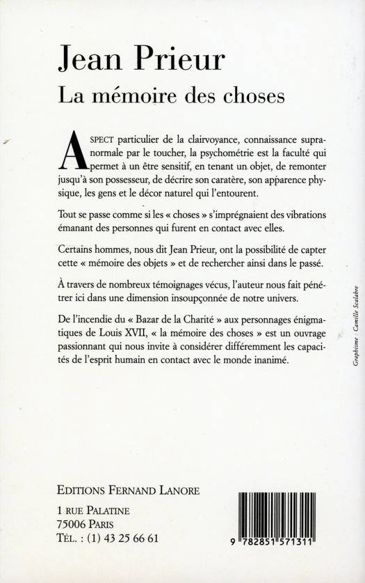 Aspect particulier de la clairvoyance, connaissance supra-normale par le toucher, la psychométrie est la faculté qui permet à un être sensitif, en tenant un objet, de remonter jusqu'à son possesseur, de décrire son caractère, son apparence physique, les gens et le décor naturel qui l'entourent. Tout se passe comme si les "choses" s'imprégnaient des vibrations émanant des personnes qui furent en contact avec elles. Certains hommes, nous dit Jean Prieur, ont la possibilité de capter cette "mémoire des objets" et de rechercher ainsi dans le passé. A travers de nombreux témoignages vécus, l'auteur nous fait pénétrer ici dans une dimension insoupçonnée de notre univers. De l'incendie du "Bazar de la Charité" aux personnages énigmatiques de Louis XVII, "la mémoire des choses" est un ouvrage passionnant qui nous invite à considérer différemment les capacités de l'esprit humain en contact avec le monde inanimé.