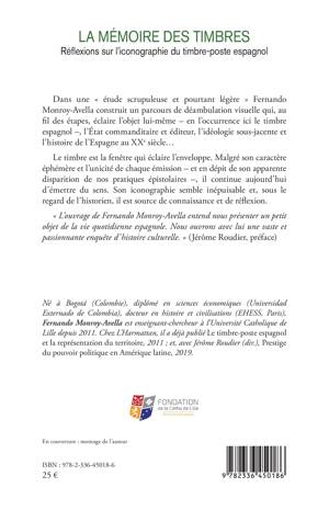 Dans une « étude scrupuleuse et pourtant légère » Fernando Monroy-Avella construit un parcours de déambulation visuelle qui, au fil des étapes, éclaire l’objet lui-même – en l’occurrence ici le timbre espagnol –, l’État commanditaire et éditeur, l’idéologie sous-jacente et l’histoire de l’Espagne au XXe siècle… Le timbre est la fenêtre qui éclaire l'enveloppe. Malgré son caractère éphémère et l’unicité de chaque émission – et en dépit de son apparente disparition de nos pratiques épistolaires –, il continue aujourd’hui d’émettre du sens. Son iconographie semble inépuisable et, sous le regard de l’historien, il est source de connaissance et de réflexion. « L’ouvrage de Fernando Monroy-Avella entend nous présenter un petit objet de la vie quotidienne espagnole. Nous ouvrons avec lui une vaste et passionnante enquête d’histoire culturelle. » (Jérôme Roudier, préface)