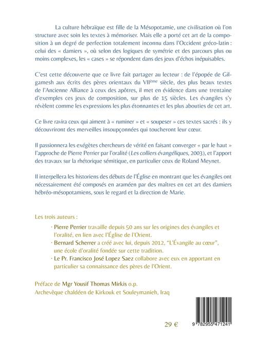 C'est cette découverte que ce livre fait partager au lecteur : de l'épopée de Gilgamesh aux écrits des pères orientaux du 7ème siècle, des plus beaux textes de l'Ancienne Alliance à ceux des apôtres, il met en évidence dans une trentaine d'exemples ces jeux de composition sur plus de 15 siècles. Les évangiles s'y révèlent comme les expressions les plus étonnantes et les plus abouties de cet art.