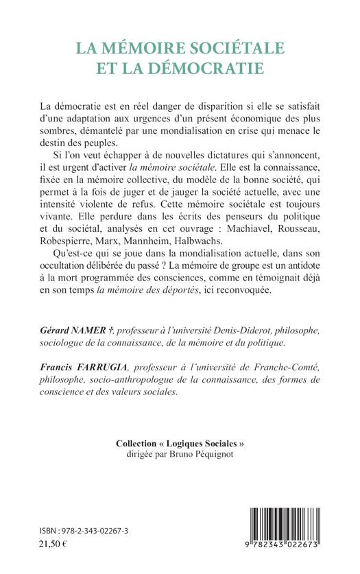 La démocratie est en danger face aux urgences d'un présent économique des plus sombres. Si l'on veut échapper à de nouvelles dictatures, la mémoire sociétale doit être activée. Elle est la connaissance, fixée en la mémoire collective, du modèle de la bonne société, qui permet à la fois de juger et de jauger la société actuelle, avec une intensité violente de refus. Elle perdure dans les écrits des penseurs du politique et du sociétal, analysés dans cet ouvrage : Machiavel, Rousseau, Marx, Mannheim, Halbwachs…