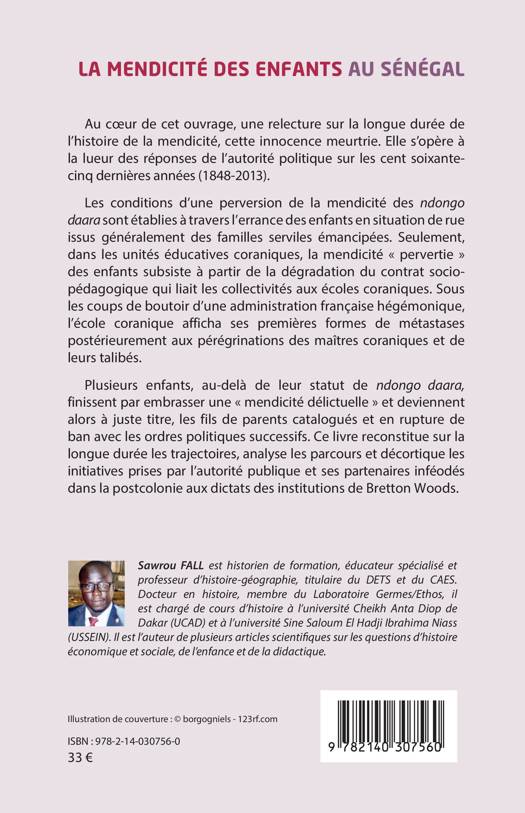 Au coeur de cet ouvrage, une relecture sur la longue durée de l'histoire de la mendicité, cette innocence meurtrie. Elle s'opère à la lueur des réponses de l'autorité politique sur les cent soixante-cinq dernières années (1848-2013). Les conditions d'une perversion de la mendicité des ndongo daara sont établies à travers l'errance des enfants en situation de rue issus généralement des familles serviles émancipées. Seulement, dans les unités éducatives coraniques, la mendicité pervertie des enfants subsiste à partir de la dégradation du contrat socio pédagogique qui liait les collectivités aux écoles coraniques. Sous les coups de boutoir d'une administration française hégémonique, l'école coranique afficha ses premières formes de métastases postérieurement aux pérégrinations des maîtres coraniques et de leurs talibés. Ce livre reconstitue sur la longue durée les trajectoires, analyse les parcours et décortique les initiatives prises par l'autorité publique et ses partenaires inféodés dans la post-colonie aux dictats des institutions de Bretton Woods.