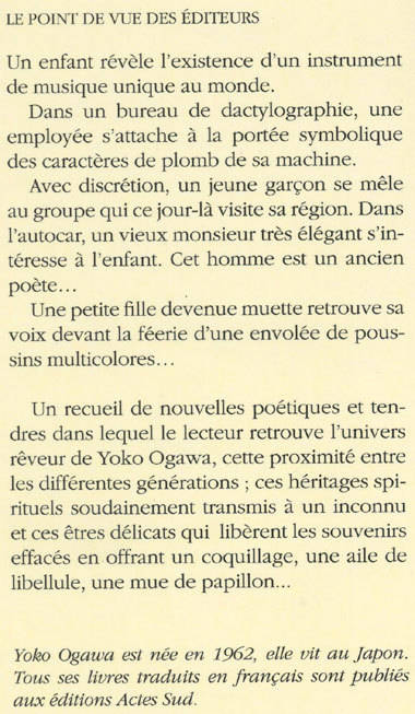 «Yoko Ogawa est née en 1962, elle vit au Japon. Tous ses livres traduits en français son publiés aux éditions Actes Sud.»