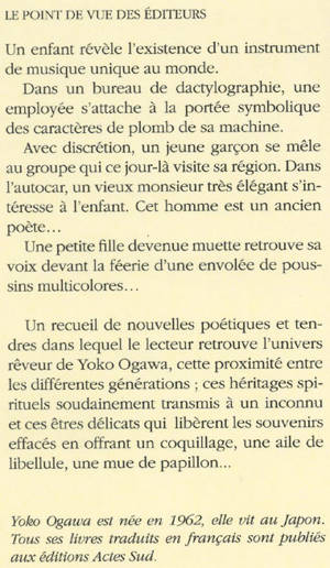 Un recueil de nouvelles poétiques et tendres dans lequel le lecteur retrouve l'univers rêveur de Yoko Ogawa, cette proximité entre les différentes générations ; ces héritages spirituels soudainement transmis à un inconnu et ces êtres délicats qui libèrent les souvenirs effacés en offrant un coquillage, une aile de libellule, une mue de papillon...