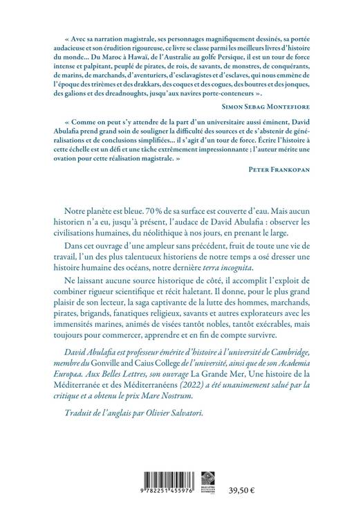 « Avec sa narration magistrale, ses personnages magnifiquement dessinés, sa portée audacieuse et son érudition rigoureuse, ce livre se classe parmi les meilleurs livres d’histoire du monde... Du Maroc à Hawaï, de l’Australie au golfe Persique, il est un tour de force intense et palpitant, peuplé de pirates, de rois, de savants, de monstres, de conquérants, de marins, de marchands, d’aventuriers, d’esclavagistes et d’esclaves, qui nous emmène de l’époque des trirèmes et des drakkars, des coques et des cogues, des boutres et des jonques, des galions et des dreadnoughts, jusqu’aux navires porte-conteneurs ». Simon Sebag Montefiore