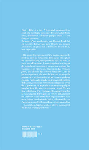 « Elle quitte l’appartement tôt le matin, emporte le petit sac à dos de randonnée dans lequel elle a glissé un thermos de thé, quelques fruits secs, un bout de pain, une clémentine, le couteau pliant, un paquet de mouchoirs, son carnet, un crayon à mine. Les raquettes et les bâtons sont fixés au sac. Les premiers jours, elle choisit des sentiers forestiers. Lors de pauses régulières, elle note la liste des mots qui la traversent — nœuds, résine, stries —, trace quelques croquis. Parfois, elle touche un tronc, suit les sillons de l’écorce, essaye d’en mémoriser les lignes au creux de la paume et les reproduire au crayon quelques pas plus loin. Ou alors, après avoir caressé l’écorce lisse et brillante d’un bouleau, elle en photographie le blanc argenté de très près, en prélève délicatement un lambeau, le cale entre deux pages du carnet. Elle ne se donne pas de dessein précis, elle recueille, en s’attachant aux détails aussi bien qu’aux ensembles — incrustation d’épines tombées à terre, mouvement des troncs courbés par le vent ».