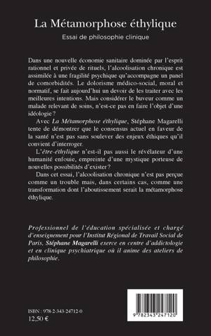 Dans une nouvelle économie sanitaire dominée par l'esprit rationnel et privée de rituels, l'alcoolisation chronique est assimilée à une fragilité psychique qu'accompagne un panel de comorbidités. Le dolorisme médico-social, se fait aujourd'hui un devoir de les traiter avec les meilleures intentions. Mais considérer le buveur comme un malade, n'est-ce pas en faire l'objet d'une idéologie ? Stéphane Magarelli tente de démontrer que le consensus actuel en faveur de la santé n'est pas sans soulever des enjeux éthiques qu'il convient d'interroger. L'être-éthylique n'est-il pas aussi le révélateur d'une humanité enfouie ? Dans cet essai, l'alcoolisation chronique n'est pas perçue comme un trouble mais, dans certains cas, comme une transformation dont l'aboutissement serait la métamorphose éthylique.