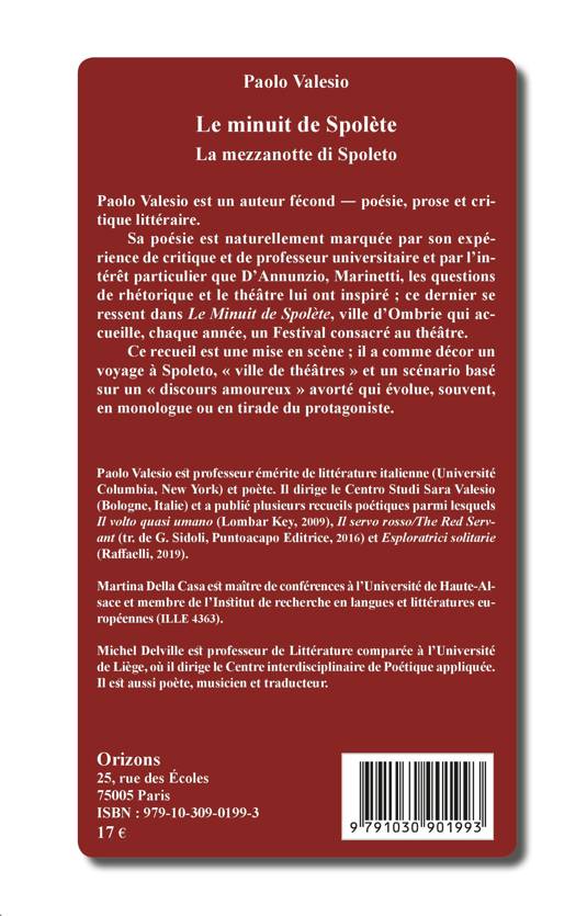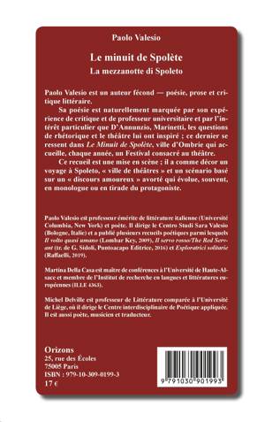 Paolo Valesio est un auteur fécond - poésie, prose et critique littéraire. Sa poésie est marquée par son expérience de critique et de professeur universitaire, connaisseur inspiré de d'Annunzio, de Marinetti, à quoi il faut ajouter les questions de rhétorique et sur le théâtre lui ont inspiré. Ce recueil est une mise en scène ; il a comme décor un voyage à Spoleto, « ville de théâtres » et un scénario basé sur un « discours amoureux » avorté qui évolue, souvent, en monologue ou en tirade du protagoniste.