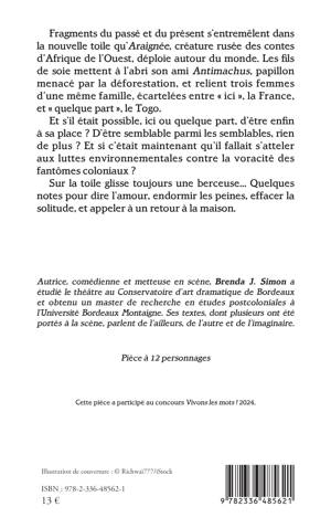 Fragments du passé et du présent s'entremêlent dans la nouvelle toile qu'Araignée, créature rusée des contes d'Afrique de l'Ouest, déploie autour du monde. Les fils de soie mettent à l'abri son ami Antimachus, papillon menacé par la déforestation, et relient trois femmes d'une même famille, écartelées entre ici, la France, et quelque part, le Togo. Et s'il était possible, ici ou quelque part, d'être enfin à sa place ? D'être semblable parmi les semblables, rien de plus ? Et si c'était maintenant qu'il fallait s'atteler aux luttes environnementales contre la voracité des fantômes coloniaux ? Sur la toile glisse toujours une berceuse... Quelques notes pour dire l'amour, endormir les peines, effacer la solitude, et appeler à un retour à la maison.
