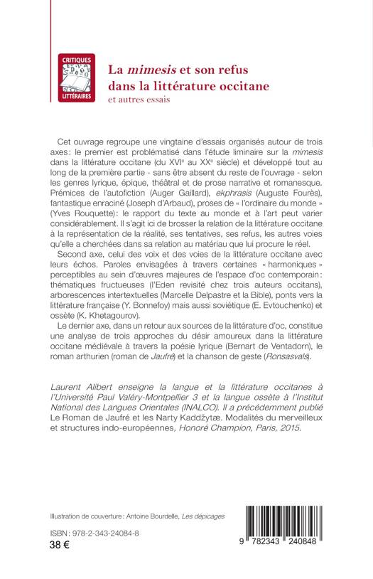 Cet ouvrage regroupe une vingtaine d’essais organisés autour de trois axes : le premier est problématisé dans l’étude liminaire sur la mimesis dans la littérature occitane (du XVIe au XXe siècle) et développé tout au long de la première partie - sans être absent du reste de l’ouvrage - selon les genres lyrique, épique, théâtral et de prose narrative et romanesque. Second axe, celui des voix et des voies de la littérature occitane avec leurs échos. Le dernier axe, dans un retour aux sources de la littérature d’oc, constitue une analyse de trois approches du désir amoureux dans la littérature occitane médiévale à travers la poésie lyrique, le roman arthurien et la chanson de geste.