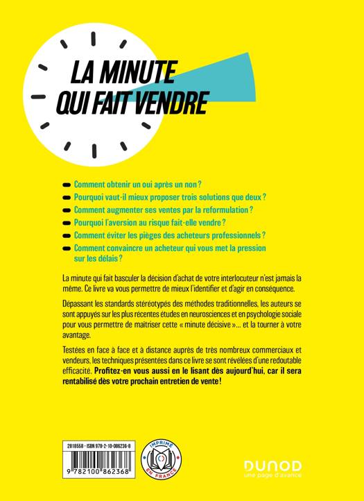 Comment obtenir un oui après un non ? Pourquoi vaut-il mieux proposer trois solutions que deux ? Comment augmenter ses ventes par la reformulation ? Pourquoi l’aversion au risque fait-elle vendre ? Comment éviter les pièges des acheteurs professionnels ? Comment convaincre un acheteur qui vous met la pression sur les délais ? La minute qui fait basculer la décision d’achat de votre interlocuteur n’est jamais la même. Ce livre va vous permettre de mieux l’identifier et d’agir en conséquence. Dépassant les standards stéréotypés des méthodes traditionnelles, les auteurs se sont appuyés sur les plus récentes études en neurosciences et en psychologie sociale pour vous permettre de maîtriser cette « minute décisive »… et la tourner à votre avantage. Testées en face à face et à distance auprès de très nombreux commerciaux et vendeurs, les techniques présentées dans ce livre se sont révélées d’une redoutable efficacité. Profitez-en vous aussi en le lisant dès aujourd’hui, car il sera rentabilisé dès votre prochain entretien de vente !