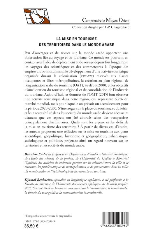 Les données de l'Organisation mondiale du tourisme font observer une activité touristique dans le monde arabe qui représente 6,2% du marché mondial, avec un accroissement prévu pour la période 2020-2030. S'interroger sur la place du tourisme et du loisir, et leur accessibilité dans les sociétés du monde arabe devient nécessaire d'autant que ces aspects sont abordés ici selon des perspectives principalement disciplinaires. A partir de divers cas d'études, les auteurs proposent une réflexion sur la mise en tourisme des territoires aux plans scientifique, géopolitique, historique, urbanistique, sociologique et politique.