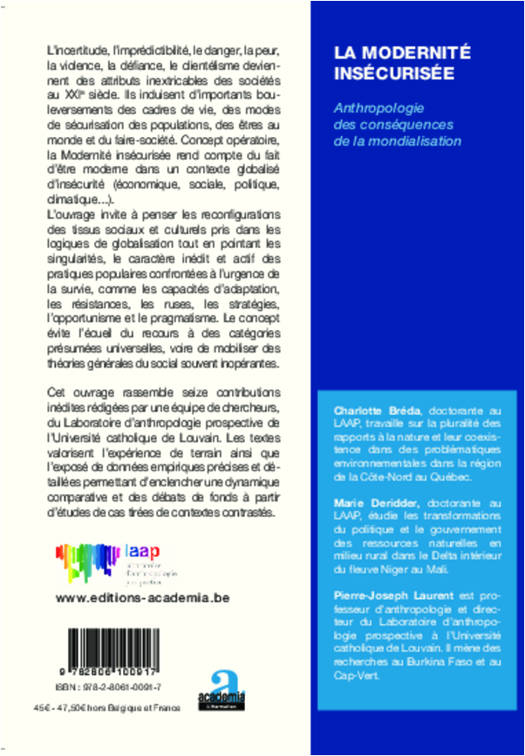 L'incertitude, l'imprédictibilité, le danger, la peur, la violence, la défiance, le clientélisme qualifient les sociétés au XXIe siècle. Les cadres de vie et les principes de la sécurité des populations sont affectés. Concept opératoire, la Modernité Insécurisée rend compte du fait d'être moderne dans un contexte globalisé d'insécurité culturelle, économique, sociale, politique et climatique. L'ouvrage pointe le caractère inédit et dynamique des pratiques des populations confrontées à la survie.