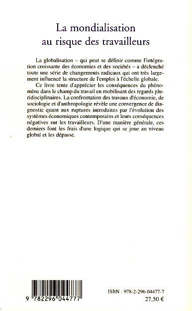La globalisation a déclenché des changements radicaux qui ont très largement influencé la structure de l'emploi. Ce livre tente d'apprécier les conséquences du phénomène dans le champ du travail. La confrontation de travaux d'économie, de sociologie et d'anthropologie révèle une convergence de diagnostic quant aux ruptures introduites par l'évolution des systèmes économiques contemporains et leurs conséquences négatives sur les travailleurs.