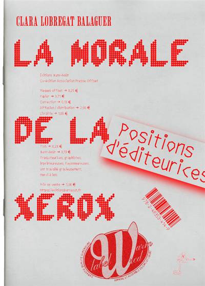 La Morale de la Xerox consiste en une traduction de deux textes, respectivement de Clara Balaguer et de Florian Cramer. Un thème commun y est abordé : l’appropriation. Clara est Philippine, et Florian, Néerlandais. Ce sont deux rapports à la question et deux passifs distincts mis en contraste. Sur le recto du livre, l’autrice s’attarde sur les problématiques d’accès à la connaissance aux Philippines, où il est nécessaire de « pirater » ses livres. Au verso, l’auteur retrace l’histoire de l’appropriation, puis un épisode où lui-même s’est fait voler ses textes par une grande institution.