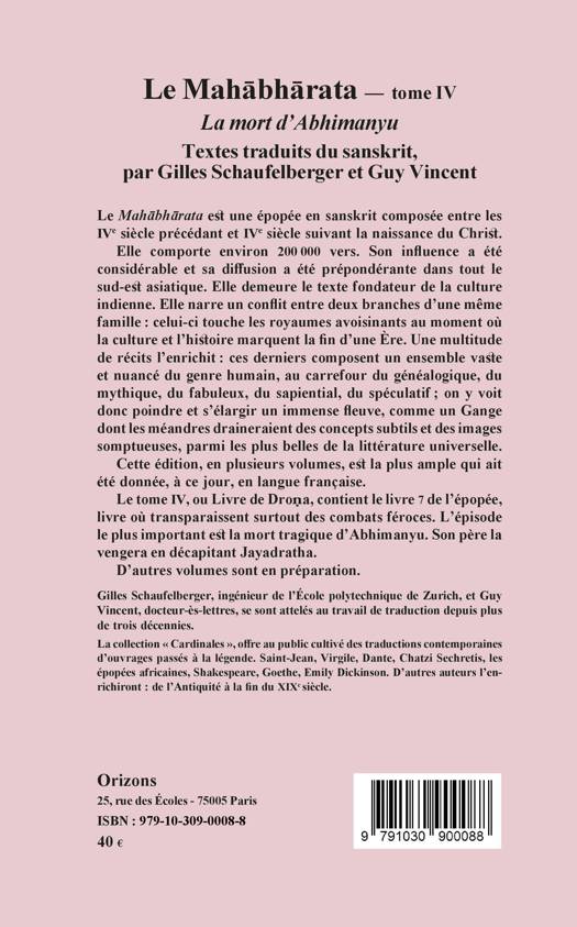 Le Mahabharata est une épopée en sanskrit composée entre les IVe siècle précédant et IVe siècle suivant la naissance du Christ. Cette édition, en plusieurs volumes, est la plus ample qui ait été donnée, à ce jour, en langue française. Le tome IV contient le livre 7 de l’épopée, livre où transparaissent surtout des combats féroces. L’épisode le plus important est la mort tragique d’Abhimanyu. Son père la vengera en décapitant Jayadratha. Les volumes V à VIII sont en préparation pour 2016 et 2017.