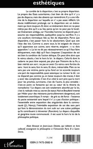 Le propre des Etats autoritaires, c'est bien de dire qu'il n'y a pas de disparus, mais des absents qui reviendront. Il y a une infamie de la disparition sur laquelle on n'a pas assez réfléchi. La disparition est un événement dont on ne peut même pas dire qu'il a eu lieu parce qu'on ne peut pas le localiser. Le disparu est soit totalement absorbé par la loi, c'est la radicale mise au secret (le statut nuit et brouillard ), soit totalement anarchique. Il rompt l'essence du pacte existentiel sans lequel il n'y a pas d'action politique. Le disparu disqualifie et gangrène toute communauté : il est aussi le hors-la-loi de la philosophie politique.