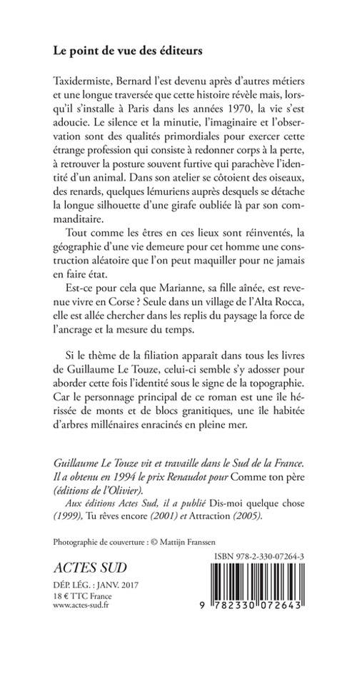 Si le thème de la filiation apparaît dans tous les livres de Guillaume Le Touze, celui-ci semble s'y adosser pour aborder cette fois l'identité sous le signe de la topographie. Car le personnage principal de ce roman est une île hérissée de monts et de blocs granitiques, une île habitée d'arbres millénaires enracinés en pleine mer.