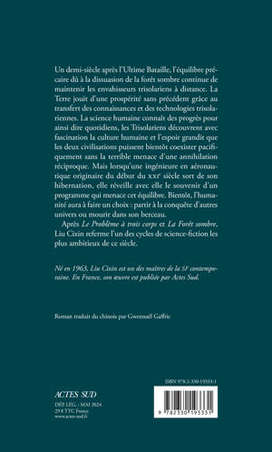 Lorsqu'une ingénieure en aéronautique originaire du début du XXIe siècle sort de son hibernation, elle réveille avec elle le souvenir d'un programme qui confronte l'humanité à un choix crucial : il en va en effet de la survie des Terriens... Après "Le Problème à trois corps" et "La Forêt sombre", Liu Cixin referme l'un des cycles de science-fiction les plus ambitieux de ce siècle. Edition collector