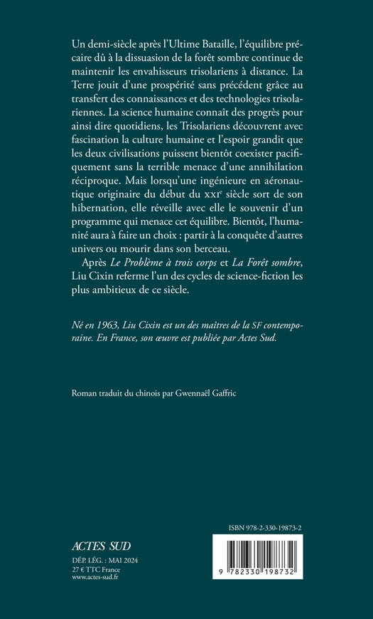 Lorsqu'une ingénieure en aéronautique originaire du début du XXIe siècle sort de son hibernation, elle réveille avec elle le souvenir d'un programme qui confronte l'humanité à un choix crucial : il en va en effet de la survie des Terriens... Après "Le Problème à trois corps" et "La Forêt sombre", Liu Cixin referme l'un des cycles de science-fiction les plus ambitieux de ce siècle.