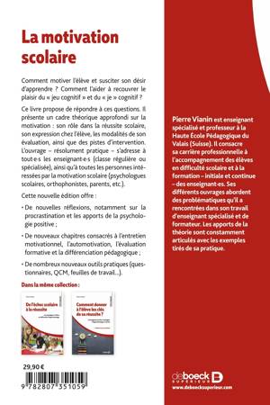 Ce livre propose de répondre à ces questions. Il présente un cadre théorique approfondi sur la motivation : son rôle dans la réussite scolaire, son expression chez l’élève, les modalités de son évaluation, ainsi que des pistes d’intervention. L'ouvrage – résolument pratique – s’adresse à tout·e·s les enseignant·e·s (classe régulière ou spécialisée), ainsi qu’à toutes les personnes intéressées par la motivation scolaire (psychologues scolaires, orthophonistes, parents, etc.).