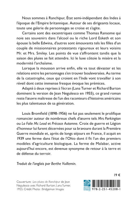 Nous sommes a Ranchipur, Etat semi-independant des Indes a l'epoque de l'Empire britannique. Autour de ses dirigeants locaux, toute une galerie de personnages se croise et s'agite. Certains sont des excentriques comme Thomas Ransome qui noie ses souvenirs dans l'alcool ou le riche Lord Esketh et son epouse la belle Edwina, d'autres sont emouvants tels les filles d'un couple de missionnaires protestants rigoureux et leurs voisins Mr. et Mrs. Smiley. Les points de vue s'affrontent tandis que la saison des pluies se fait attendre. Ici le luxe cotoie la misere et la modernite l'archaisme. Lorsque la mousson arrive enfin, elle va tout devaster et les relations entre les personnages s'en trouver bouleversees. Au terme de la catastrophe, ceux qui croient en l'Inde vont travailler a son reveil dont cette immense fresque evoque les premices. Adapte a deux reprises a l'ecran (Lana Turner et Richard Burton dominent la version de Jean Negulesco en 1955), ce grand roman reste l'oeuvre maitresse de l'un des raconteurs d'histoires americains les plus talentueux de sa generation.