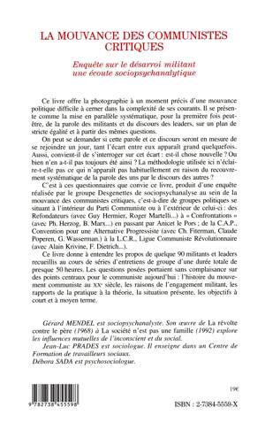 Ce livre offre la photographie à un moment précis d’une mouvance politique difficile à cerner dans la complexité de ses courants. Il se présente comme la mise en parallèle systématique, pour la première fois peut-être, de la parole des militants et du discours des leaders, sur un plan de stricte égalité et à partir des mêmes questions. Ce livre donne à entendre les propos de quelque 90 militants et leaders recueillis au cours de séries d’entretiens de groupe. Les questions posées portaient sans complaisance sur des points centraux pour le communiste aujourd’hui : l’histoire du mouvement communiste au XXème siècle, les raisons de l’engagement militant, les rapports de la pratique à la théorie, la situation présente, les objectifs à court et moyen terme.