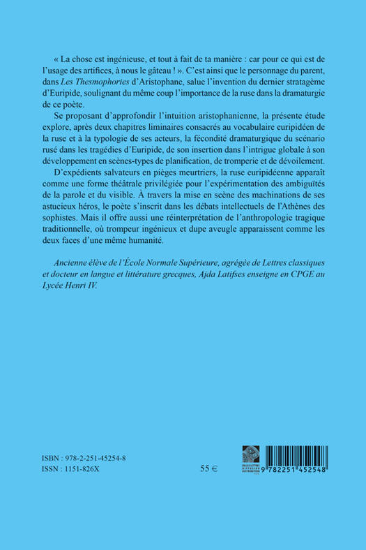 La chose est ingenieuse, et tout a fait de ta maniere: car pour ce qui est de l'usage des artifices, a nous le gateau ! . C'est ainsi que le personnage du parent, dans Les Thesmophories d'Aristophane, salue l'invention du dernier stratageme d'Euripide, soulignant du meme coup l'importance de la ruse dans la dramaturgie de ce poete.Se proposant d'approfondir l'intuition aristophanienne, la presente etude explore, apres deux chapitres liminaires consacres au vocabulaire euripideen de la ruse et a la typologie de ses acteurs, la fecondite dramaturgique du scenario ruse dans les tragedies d'Euripide, de son insertion dans l'intrigue globale a son developpement en scenes-types de planification, de tromperie et de devoilement. D'expedients salvateurs en pieges meurtriers, la ruse euripideenne apparait comme une forme theatrale privilegiee pour l'experimentation des ambiguites de la parole et du visible. A travers la mise en scene des machinations de ses astucieux heros, le poete s'inscrit dans les debats intellectuels de l'Athenes des sophistes. Mais il offre aussi une reinterpretation de l'anthropologie tragique traditionnelle, ou trompeur ingenieux et dupe aveugle apparaissent comme les deux faces d'une meme humanite.