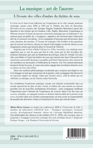 Ce livre est le fruit d'une réflexion sur l'expérience de la ville comme matériau artistique, menée par le Théâtre des Sens de Barcelone. En considérant l'expérience poétique comme une attitude existentielle dans un monde de plus en plus virtuel, le théâtre des sens montre un chemin possible vers de nouvelles modulations d'existence : cette compagnie réaffirme l'importance pour l'humain de l'expérience du sentir(e), qui entend créer dans l'obscurité une expérience sensorielle destinée à un public effectif dont l'interaction entre chacun de ses membres est nécessaire à l'édification de l'oeuvre.
