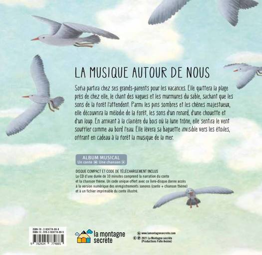 Sofia partira chez ses grands-parents pour les vacances. Elle quittera la plage près de chez elle, le chant des vagues et les murmures du sable, sachant que les sons de la forêt l'attendent. Parmi les pins sombres et les chênes majestueux, elle découvrira la mélodie de la forêt, les sons d'un renard, d'une chouette et d'un loup. En arrivant à la clairière du bois où la lune trône, elle sentira le vent souffler comme au bord l'eau. Elle lèvera sa baguette invisible vers les étoiles, offrant en cadeau à la forêt la musique de la mer.