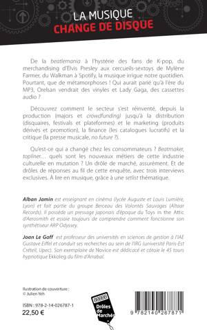 De la beatlemania à l’hystérie des fans de K-pop, du merchandising d’Elvis Presley aux cercueils-sextoys de Mylène Farmer, du Walkman à Spotify, la musique irrigue notre quotidien. Pourtant, que de métamorphoses ! Qui aurait parié qu’à l’ère du MP3, Orelsan vendrait des vinyles et Lady Gaga, des cassettes audio ? Découvrez comment le secteur s’est réinventé, depuis la production (majors et crowdfunding) jusqu’à la distribution (disquaires, festivals et plateformes) et le marketing (produits dérivés et promotion), la finance (les catalogues lucratifs) et la critique (la presse musicale, no future ?). Qu’est-ce qui a changé chez les consommateurs ? Beatmaker, topliner... quels sont les nouveaux métiers de cette industrie culturelle en mutation ? Un drôle de marché, assurément. Et de drôles de réponses au fil de cette enquête, avec trois interviews exclusives.