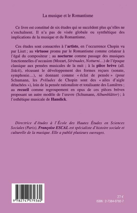 L'ouvrage de Françoise ESCAL La musique et le romantisme interroge aussi bien des représentations du musicien romantique, compositeur (Chopin) ou interprète virtuose (Liszt), que des marques et des aspects proprement musicaux : le nocturne, la pièce brève (all. Stück), le recueil (all. Sammlung) ; ou encore un traité d'esthétique musicale fameux en son époque, celui d'Eduard Hanslick.