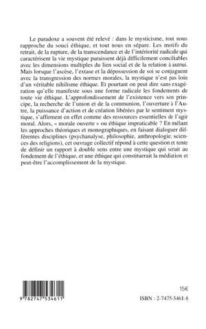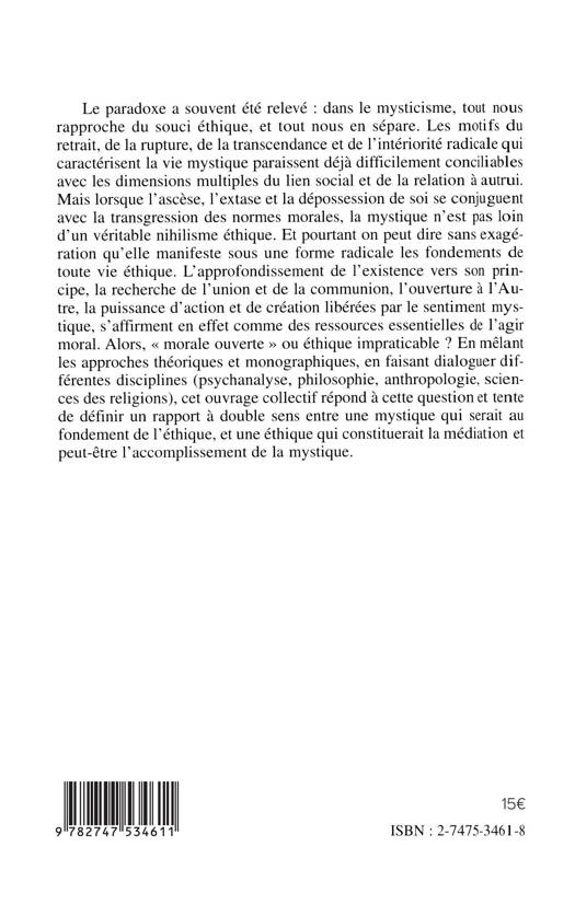 Dans le mysticisme, tout nous rapproche du souci éthique, et tout nous en sépare. Les motifs du retrait, de la transcendance et de l'intériorité radicale qui caractérisent la vie mystique paraissent déjà difficilement conciliables avec les dimensions multiples du lien social et de la relation à autrui. Mais lorsque l'ascèse, l'extase et la dépossession de soi se conjuguent avec la transgression des normes morales, la mystique n'est pas loin d'un véritable nihilisme éthique. Pourtant, elle manifeste sous une forme radicale les fondements de toute vie éthique. Cet ouvrage tente de définir un rapport à double sens entre une mystique qui serait au fondement de l'éthique, et une éthique qui constituerait la médiation et peut-être l'accomplissement de la mystique.