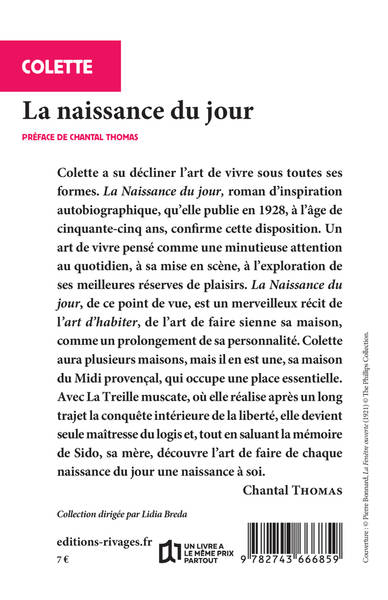Colette a su décliner l'art de vivre sous toutes ses formes. "La Naissance du jour", roman d'inspiration autobiographique, qu'elle publie en 1928, à l'âge de cinquante-cinq ans, confirme cette disposition. Un art de vivre pensé comme une minutieuse attention au quotidien, à sa mise en scène, à l'exploration de ses meilleures réserves de plaisir. "La Naissance du jour", de ce point de vue, est un merveilleux récit de "l'art d'habiter", de l'art de faire sienne sa maison, comme un prolongement de sa personnalité. Colette aura plusieurs maisons, mais il en est une, sa maison du Midi provençal, qui occupe une place essentielle. Avec La Treille muscate, où elle réalise, après un long trajet, la conquête intérieure de la liberté, elle devient seule maîtresse du logis, et, tout en saluant la mémoire de Sido, sa mère, découvre l'art de faire de chaque naissance du jour une naissance à soi. (Chantal Thomas)