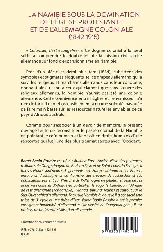 Coloniser, c'est évangéliser . Ce dogme colonial à lui seul suffit à comprendre le double-jeu de la mission civilisatrice allemande sur fond d'expansionnisme en Namibie. Près d'un siècle et demi plus tard (1884), subsistent des symboles et stigmates éloquents, tel ce drapeau allemand qui a suivi les religieux et marchands allemands dans leur conquête, donnant ainsi raison à ceux qui clament que sans l'oeuvre des religieux allemands, la Namibie n'aurait pas été une colonie allemande. Cette connivence entre l'Église et l'envahisseur n'a rien de fortuit et met ostensiblement à nu une volonté inavouée de faire main basse sur les ressources naturelles enviables de ce pays d'Afrique australe. Comme pour s'associer à un devoir de mémoire, le présent ouvrage tente de reconstituer le passé colonial de la Namibie en pointant le coût humain et le passif en droits humains d'une rencontre qui fut l'une des plus traumatisantes avec l'Occident.