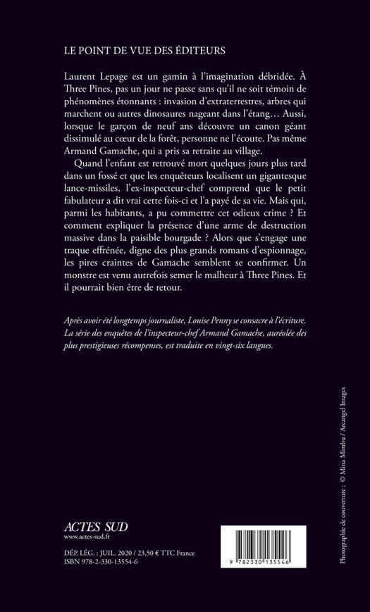 Quand l'enfant est retrouvé mort quelques jours plus tard dans un fossé et que les enquêteurs localisent un gigantesque lance-missiles, l'ex-inspecteur-chef comprend que le petit fabulateur a dit vrai cette fois-ci et l'a payé de sa vie. Mais qui, parmi les habitants, a pu commettre cet odieux crime ? Et comment expliquer la présence d'une arme de destruction massive dans la paisible bourgade ? Alors que s'engage une traque effrénée, digne des plus grands romans d'espionnage, les pires craintes de Gamache semblent se confirmer. Un monstre est venu autrefois semer le malheur à Three Pines. Et il pourrait bien être de retour.