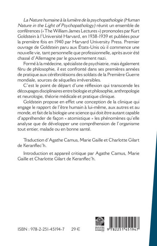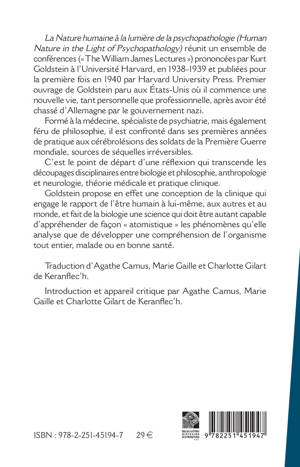La Nature humaine a la lumiere de la psychopathologie (Human Nature in the Light of Psychopathology) reunit un ensemble de confe'rences (The William James Lectures) prononce'es par Kurt Goldstein a` l'Universite' Harvard, en 1938-1939 et publie'es pour la premie`re fois en 1940 par Harvard University Press. Premier ouvrage de Goldstein paru aux Etats-Unis ou il commence une nouvelle vie, tant personnelle que professionnelle, apres avoir ete chasse d'Allemagne par le gouvernement nazi. Forme a la medecine, specialiste de psychiatrie, mais egalement feru de philosophie, il est confronte dans ses premieres annees de pratique aux cerebrolesions des soldats de la Premiere Guerre mondiale, sources de sequelles irreversibles. C'est le point de depart d'une reflexion qui transcende les decoupages disciplinaires entre biologie et philosophie, anthropologie et neurologie, theorie medicale et pratique clinique. Goldstein propose en effet une conception de la clinique qui engage le rapport de l'etre humain a lui-meme, aux autres et au monde, et fait de la biologie une science qui doit etre autant capable d'apprehender de facon atomistique les phenomenes qu'elle analyse que de developper une comprehension de l'organisme tout entier, malade ou en bonne sante.