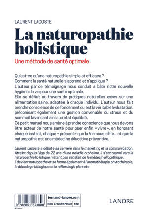Qu’est-ce qu’une naturopathie simple et efficace ? Comment la santé naturelle s’apprend et s’applique ? L’auteur par ce témoignage nous conduit à bâtir notre nouvelle hygiène de vie pour une santé optimale. Elle se définit au travers de pratiques naturelles axées sur une alimentation saine, adaptée à chaque individu. L’auteur nous fait prendre conscience de ce fondement qu’est la véritable hydratation, préconisant également une gestion convenable du stress et du sommeil favorisant ainsi un état équilibré. Ce petit manuel nous amène à prendre conscience que nous devons être acteur de notre santé pour oser enfin «?vivre?», en honorant chaque instant, chaque «?présent?» que la Vie nous offre... et que la naturopathie est une médecine éducative préventive.
