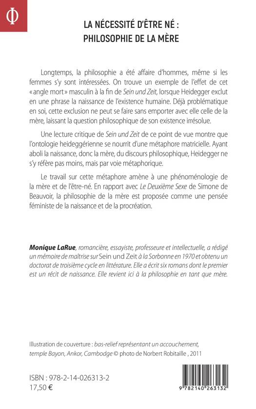 Longtemps, la philosophie a été affaire d'hommes, même si les femmes s'y sont intéressées. On trouve un exemple de l'effet de cet « angle mort » masculin à la fin de Sein und Zeit, lorsque Heidegger exclut en une phrase la naissance de l'existence humaine. Déjà problématique en soi, cette exclusion ne peut se faire sans emporter avec elle celle de la mère, laissant la question philosophique de son existence irrésolue. Une lecture critique de Sein und Zeit de ce point de vue montre que l'ontologie heideggérienne se nourrit d'une métaphore matricielle. Ayant aboli la naissance, donc la mère, du discours philosophique, Heidegger ne s'y réfère pas moins, mais par voie métaphorique. Le travail sur cette métaphore amène à une phénoménologie de la mère et de l'être-né. En rapport avec Le Deuxième Sexe de Simone de Beauvoir, la philosophie de la mère est proposée comme une pensée féministe de la naissance et de la procréation.