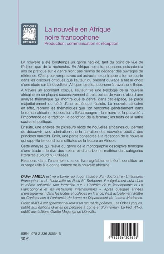 A travers un abondant corpus, l'auteur tire une typologie de la nouvelle africaine en se plaçant successivement à trois points de vue : d'abord une analyse thématique qui montre que le genre se place majoritairement du côté d'une esthétique réaliste. Ensuite, une analyse de plusieurs récits de nouvelles africaines permettant de découvrir que la narration des nouvelles obéit à des principes narratifs. Enfin, une partie est consacrée à la réception de la nouvelle qui rappelle les conditions difficiles de lecture en Afrique.