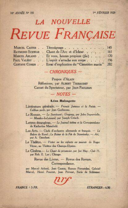 Marcel Caster, Témoignage Raymond Schwab, Chant de l'Arc et d'Ishtar Marcel Arland, Et vous, heures propices... (Fin) Paul Valéry, L'esprit s'arrache aux corps... Gustave Cohen, Essai d'explication du Cimetičre marin de Paul Valéry Alain, Propos