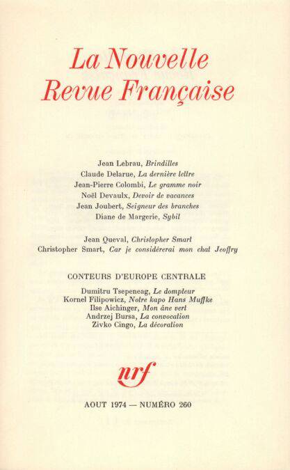 Jean Lebrau, Brindilles Claude Delarue, La dernière lettre Jean-Pierre Colombi, Le gramme noir Noël Devaulx, Devoir de vacances Jean Joubert, Poèmes Diane de Margerie, Sybil Jean Queval, Christopher Smart Christopher Smart, Car je considérerai mon chat Jeoffry