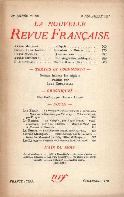 André Malraux, L'Espoir (Épisodes) Pierre Jean Jouve, Grandeur actuelle de Mozart Henri Michaux, Documentaire André Siegfried, Une géographie de l'opinion politique est-elle possible? Herman Melville, Benito Cereno (Fin) Pierre Leyris, Réflexions sur Benito Cereno