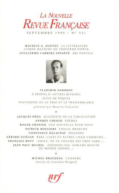 Maurice G. Dantec, La Littérature comme machine de troisième espèce Guillermo Cabrera Infante, Ars poetica Maurice Couturier, Vladimir Nabokov Vladimir Nabokov, À propos d'Autres rivages - Pluie de Pâques - Pouchkine ou Le vrai et le vraisemblable Jacques Réda, Accidents de la circulation Andrée Chedid, Poèmes Roger Grenier, Une nouvelle pour vous Patrick Roegiers, Vieille branche Constance Delaunay, Poissons Gérard Guégan, Bars, cafés et autres lieux communs dans la dernière année du siècle François Bott, 'Émile, ne te couche pas trop tard...' Jean-Paul Michel, 'Défends-toi, sublime Beauté du monde donné!' Jean-Paul Michel - Tristan Horde, 'La panthère cherche le fouet. Le fouet la cherche.' (Entretien) Michel Braudeau, L'Ennemi. Dessins de Jonathan Bougard Serge Chauvin, De ce côté de l'arc-en-ciel (Relais américains, II)