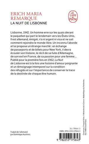 Lisbonne, 1942. Un homme erre sur les quais du port devant le paquebot qui part le lendemain vers les Etats-Unis. Il est emigre allemand, il n'a ni argent ni visa et ne sait comment rejoindre le monde libre. Un inconnu l'aborde et lui propose un etrange marche en echange de passeports et de billets pour New-York, il devra ecouter son histoire, le recit de sa fuite d'Allemagne, de son exil en France, de sa passion pour une femme... Publie pour la premiere fois en 1962, La Nuit de Lisbonne est a la fois une poignante histoire d'amour et un temoignage intemporel sur la condition des refugies et sur l'importance de conserver la trace de la destinee de chaque etre humain.