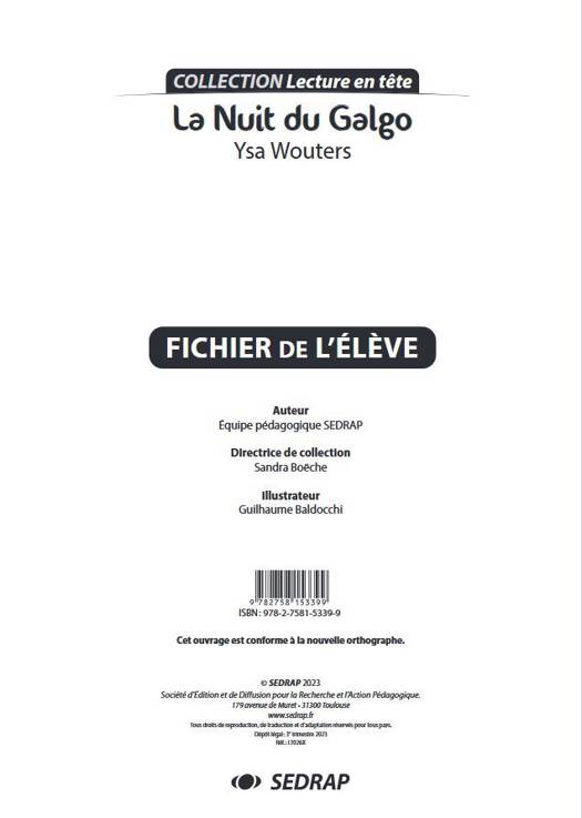 L’ouvrage « La nuit du Galgo » de Ysa Wouters – collection « Lecture en tête » est accompagné d’un fichier pédagogique de 20 fiches de lecture suivie à photocopier, contenant des activités autour du texte, des personnages, du temps et de la narration. Certaines fiches sont également dédiées à la production écrite ou à l’étude de la langue.