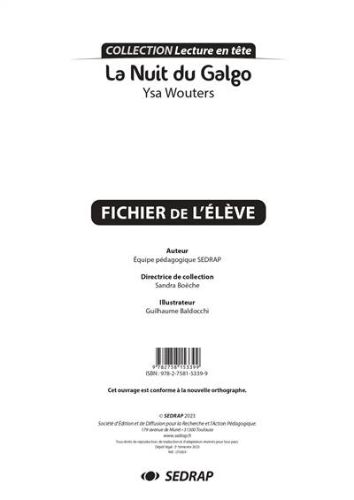 L’ouvrage « La nuit du Galgo » de Ysa Wouters – collection « Lecture en tête » est accompagné d’un fichier pédagogique de 20 fiches de lecture suivie à photocopier, contenant des activités autour du texte, des personnages, du temps et de la narration. Certaines fiches sont également dédiées à la production écrite ou à l’étude de la langue.