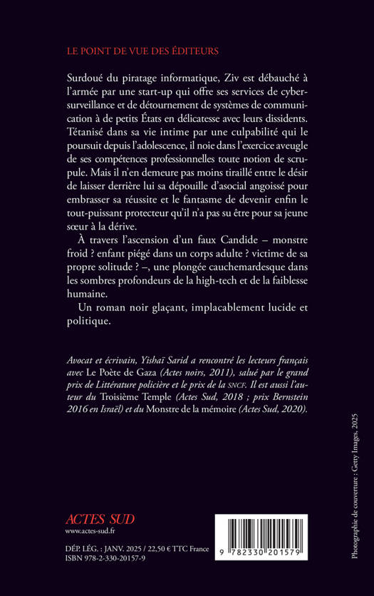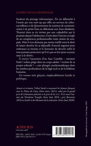 Surdoué du piratage informatique, Ziv est débauché à l'armée par une start-up qui offre ses services de cybersurveillance et de détournement de systèmes de communication à de petits États en délicatesse avec leurs dissidents. Tétanisé dans sa vie intime par une culpabilité qui le poursuit depuis l'adolescence, il noie dans l'exercice aveugle de ses compétences professionnelles toute notion de scrupule. Mais il n'en demeure pas moins tiraillé entre le désir de laisser derrière lui sa dépouille d'asocial angoissé pour embrasser sa réussite et le fantasme de devenir enfin le tout-puissant protecteur qu'il n'a pas su être pour sa jeune soeur à la dérive. À travers l'ascension d'un faux Candide - monstre froid ? enfant piégé dans un corps adulte ? victime de sa propre solitude ? -, une plongée cauchemardesque dans les sombres profondeurs de la high-tech et de la faiblesse humaine. Un roman noir glaçant, implacablement lucide et politique.